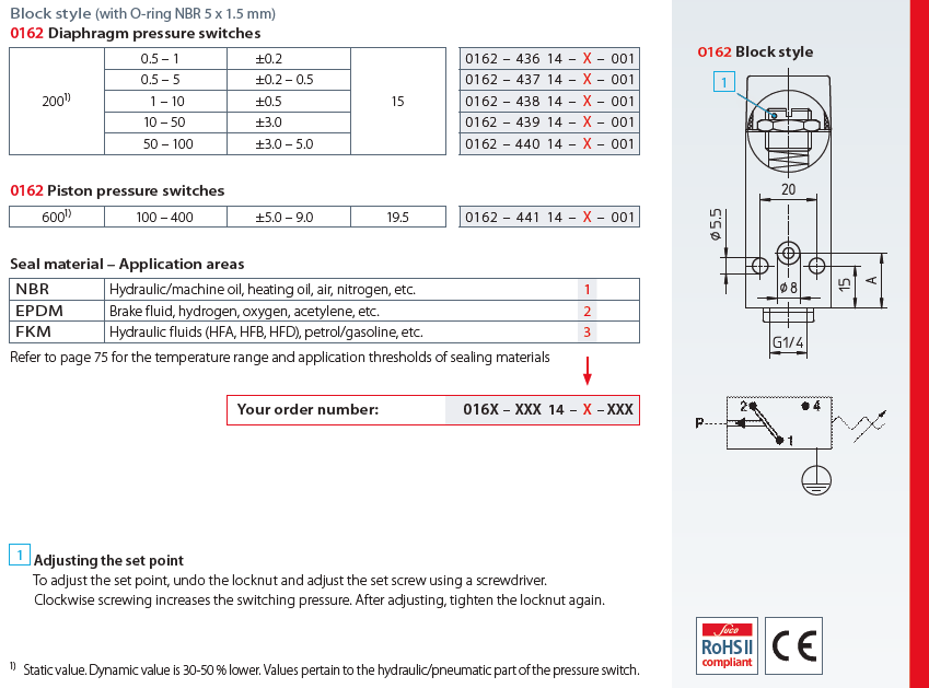 機(jī)械壓力開關(guān)既可以采用出廠設(shè)置的固定開關(guān)點(diǎn),也可以采用可調(diào)開關(guān)點(diǎn)。不過,大多數(shù)型號(hào)的滯后(也稱為壓差)通常不可調(diào)。滯后是指觸發(fā)壓力開關(guān)(開關(guān)點(diǎn))所設(shè)定的壓力值與使其返回初始位置所需的壓力值之間的差值。