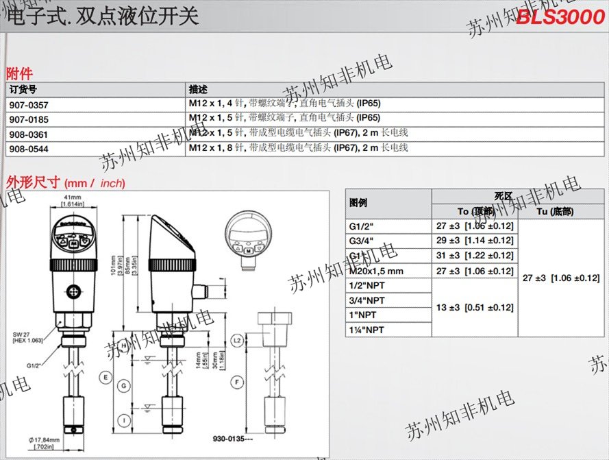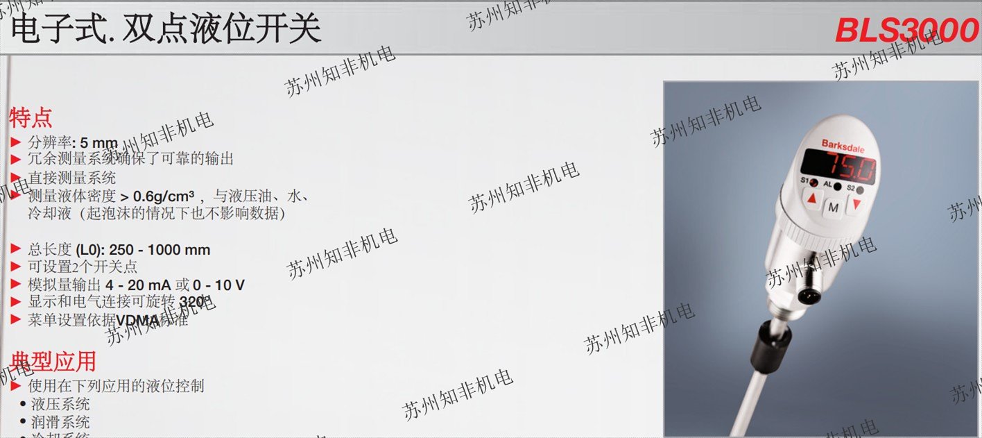 Barksdale的BLS3000將液位計(jì),液位開關(guān)和液位變送器功能集于一身。BPS3000有三種配置:1)雙開關(guān)點(diǎn),2)雙開關(guān)點(diǎn),模擬輸出(4-20 mA或0-10 V),或 3)單個(gè)開關(guān)與模擬輸出。設(shè)定點(diǎn)和死區(qū)使用,其中的滯環(huán)可以設(shè)置到它的測量范圍的125%,友好的菜單可容易地調(diào)整。模擬量輸出可從25%調(diào)節(jié)到滿量程的100%。BLS3000提供了一個(gè)易于閱讀的4位14段LED傾斜顯示屏,可旋轉(zhuǎn)320°。BLS3000是需要精密級控制,靈活性和極長的使用壽命應(yīng)用的解決方案。