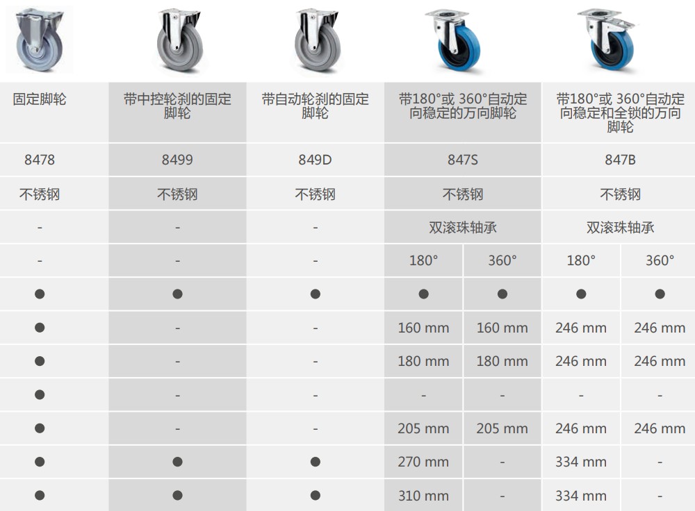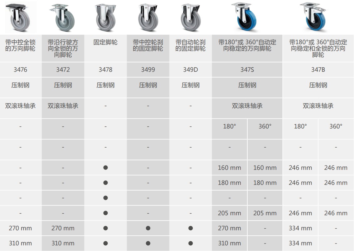 優(yōu)化轉(zhuǎn)向機(jī)制 用于改善曲線轉(zhuǎn)向和長距離直線駕駛的方向剎。 輕松轉(zhuǎn)向 雙滾珠軸承旋轉(zhuǎn)頭。 用戶友好型中控鎖 使用中心操縱桿同時鎖定多個腳輪。 實用系統(tǒng)解決方案 帶有所有中控鎖技術(shù)組件的實用系統(tǒng)解決方案。 多種選擇的接頭 不同的安裝尺寸適用范圍 。