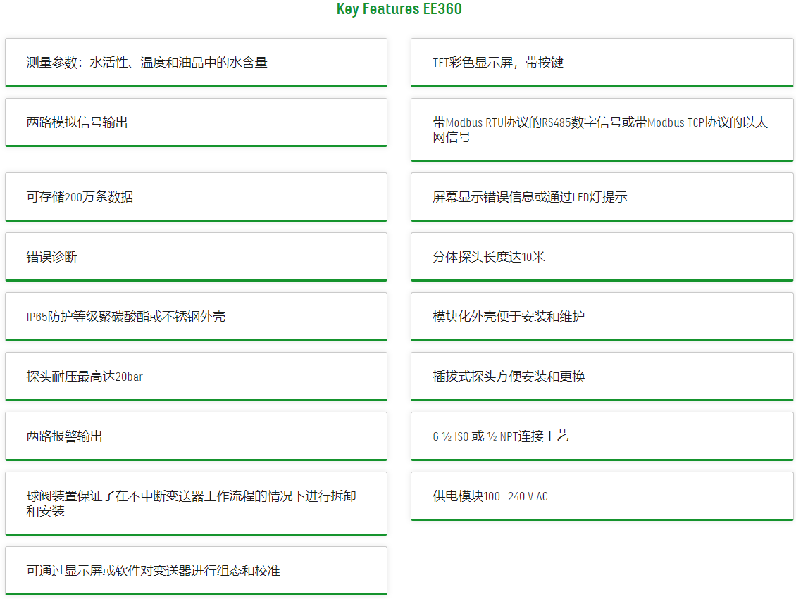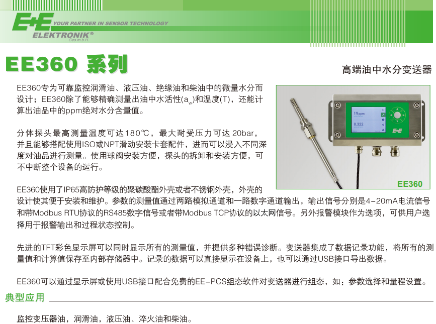 EE360專為可靠監(jiān)控變壓器油、潤滑油、液壓油、絕緣油和柴油中的微量水分而設計;EE360除了能精密測量出油中水活性(aw)和溫度(T),還能計算出油品中的含水量值(ppm)。