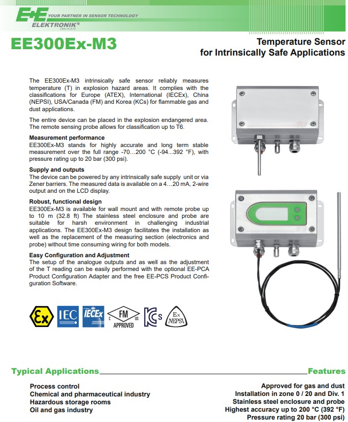 EE300EX-M3是一種本質(zhì)安全的防爆溫度變送器,專為危險應用而設計。符合歐洲(ATEX),國際(IECEx),美國/加拿大(FM)和韓國(KCs)本地儀器規(guī)范的要求。因此,EE300EX可以在危險的粉塵或易燃環(huán)境中工作。