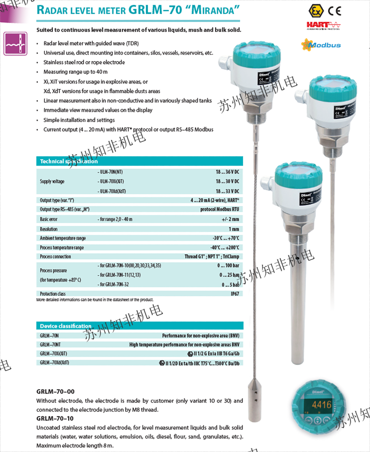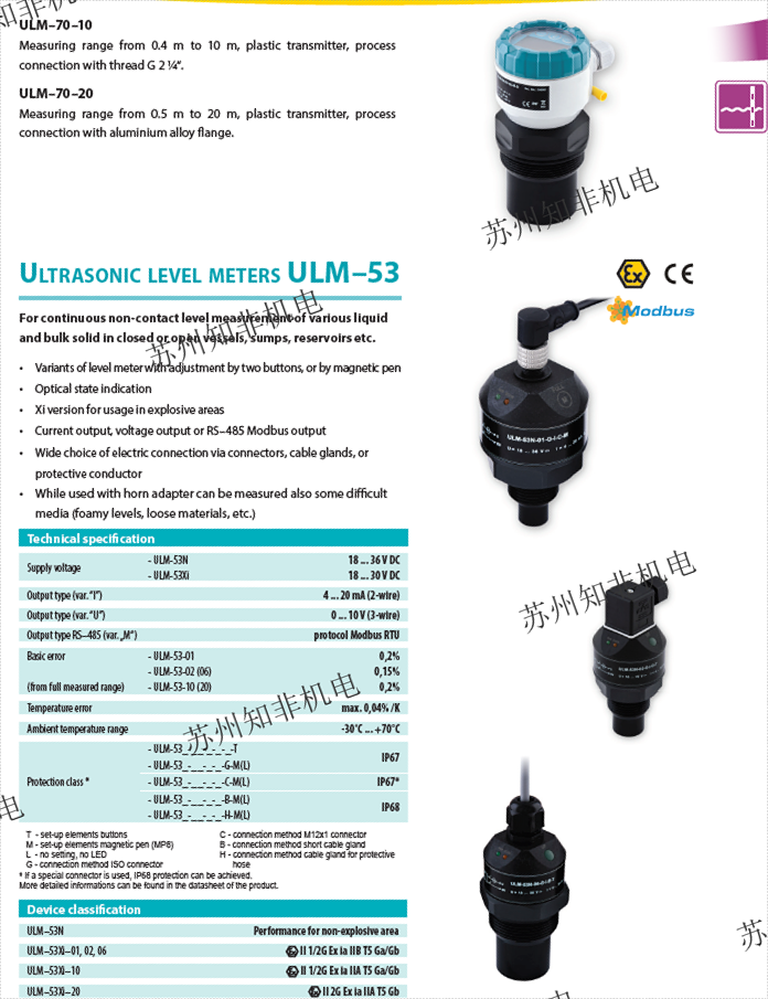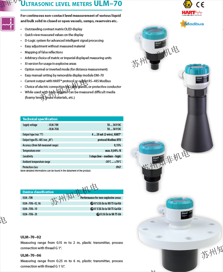 ?ULM-70?:采用高頻雷達技術,測量范圍2~40米,支持防爆和防塵型號,適用于液體、固體及糊狀材料。 ?