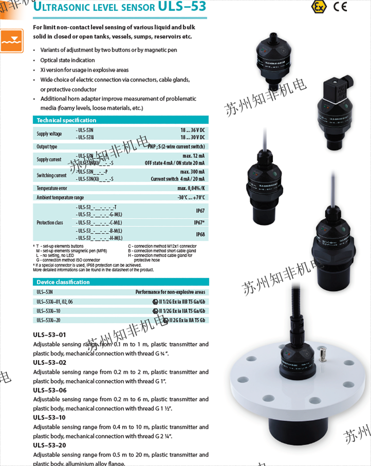 ?ULS–53_–20–_測量范圍0.5米至20米,全塑料PVDF外殼,帶法蘭的機械連接鋁合金。